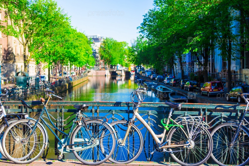 Красочные велосипеды на мосту в городе Амстердам, Нидерланды