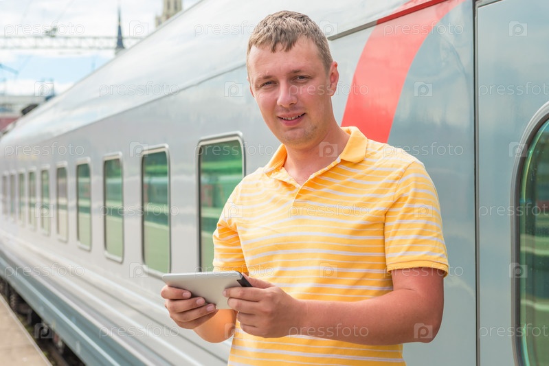Счастливый человек вблизи поезда