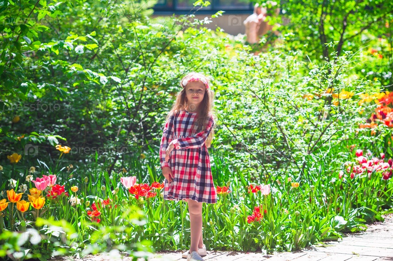 Очаровательная девочка с цветами в саду