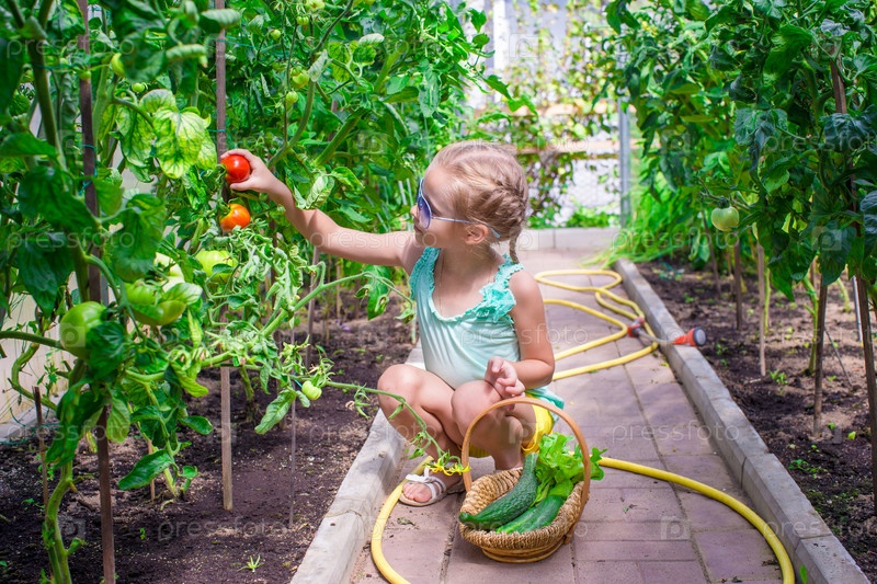 Маленькая девочка, собирая урожай в парнике