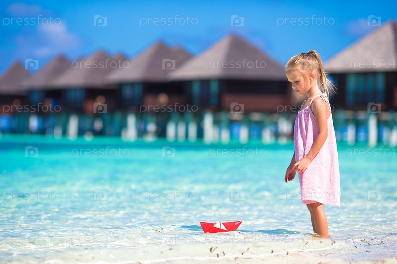 Маленькая девочка, играя с бумажным корабликом