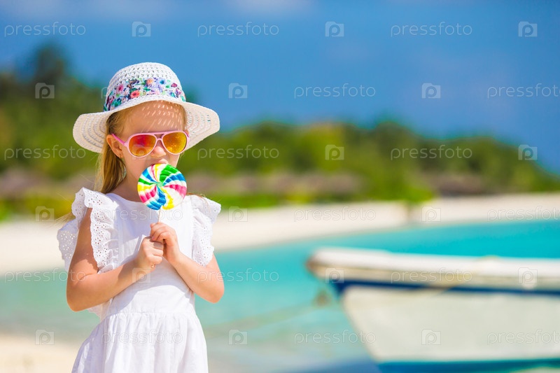 Маленькая девочка с леденецом на тропическом пляже