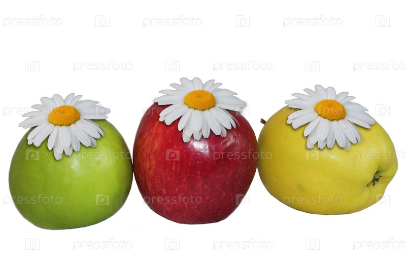 Три спелых сочных яблока с цветами ромашки на белом фоне