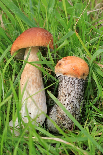 Два съедобных молодых гриба на зеленой траве