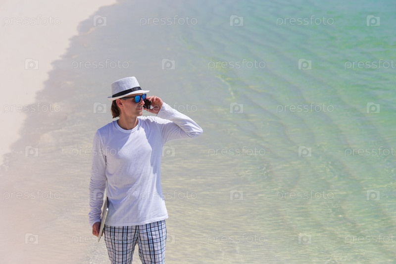 Молодой человек разговаривает по телефону на пляже