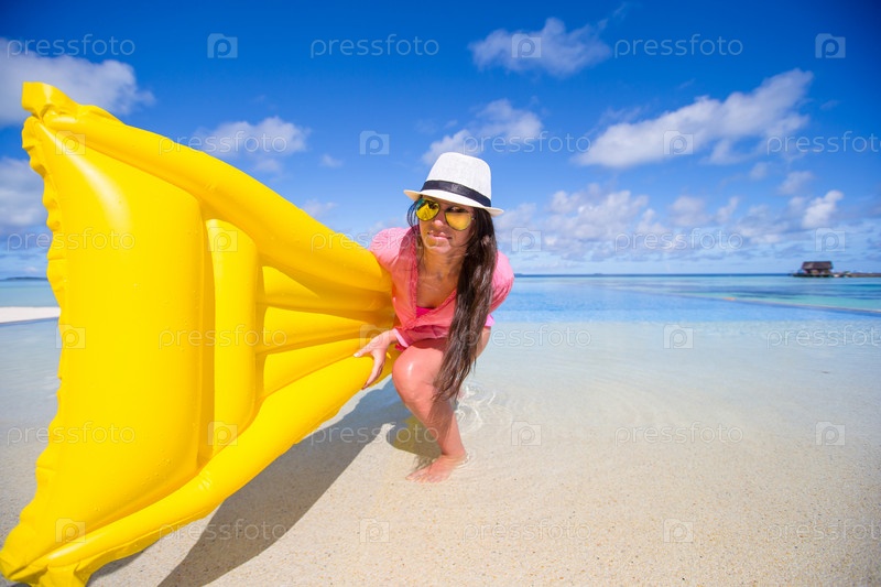 Девушка с надувным матрасом на пляже