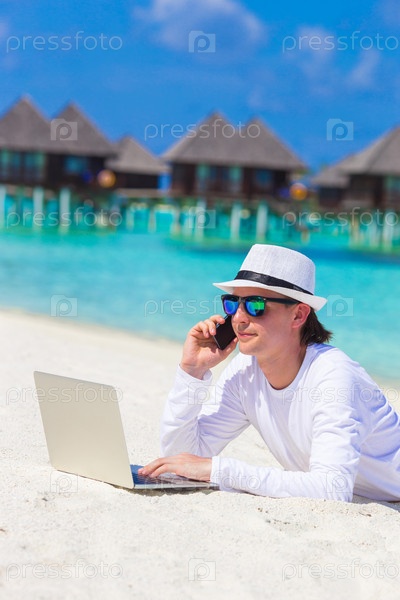 Молодой человек с гаджетами на пляже