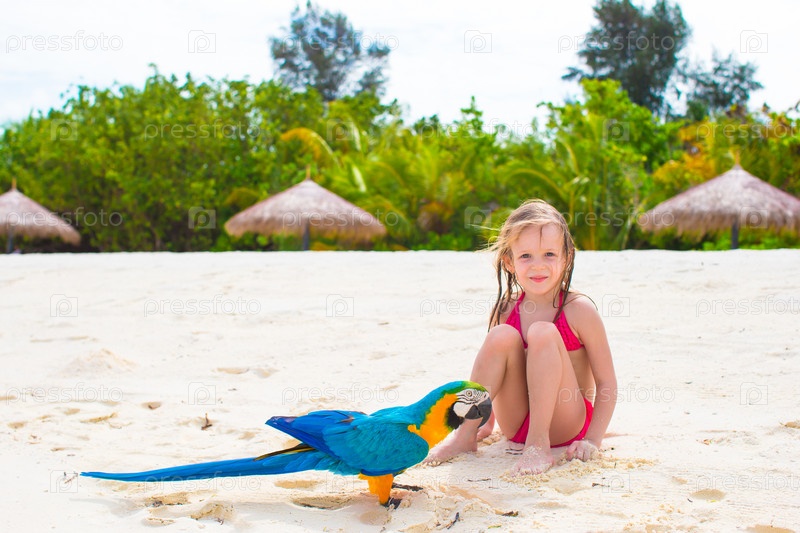 Очаровательная маленькая девочка на пляже с попугаем
