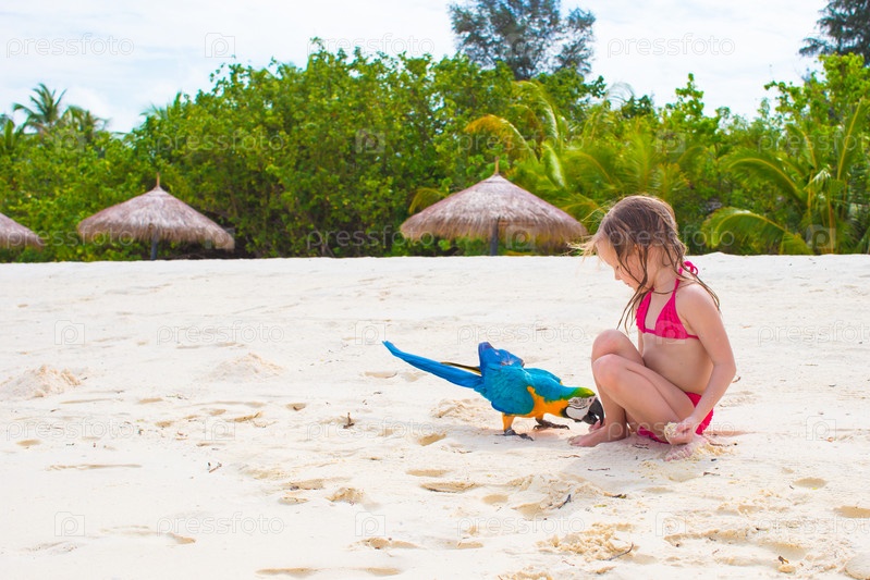 Маленькая девочка на пляже с попугаем