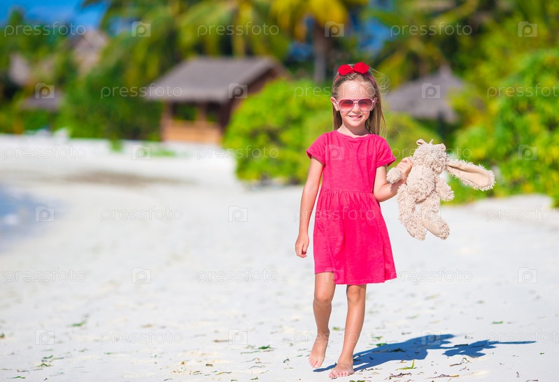 Очаровательная маленькая девочка играет с игрушкой во время пляжного отдыха