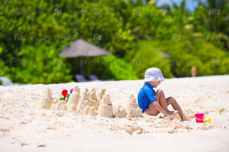 Маленькая девочка, играя с игрушками на пялже