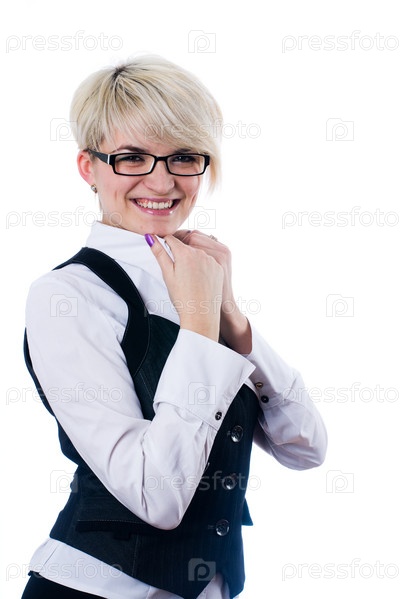 Улыбающаяся молодая женщина в очках, изолирована на белом фоне