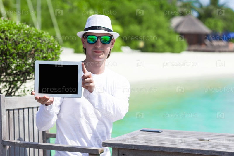 Молодой человек на пляже с планшетным компьютером