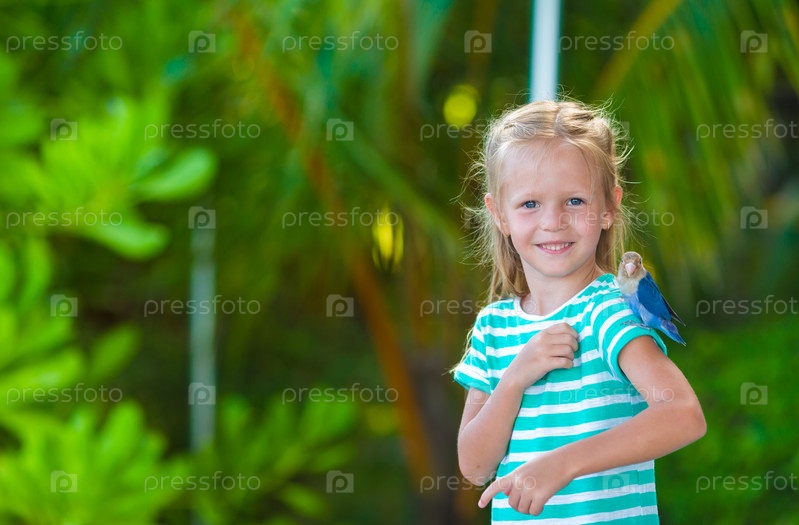 Счастливая девочка на пляже с красочной птичкой