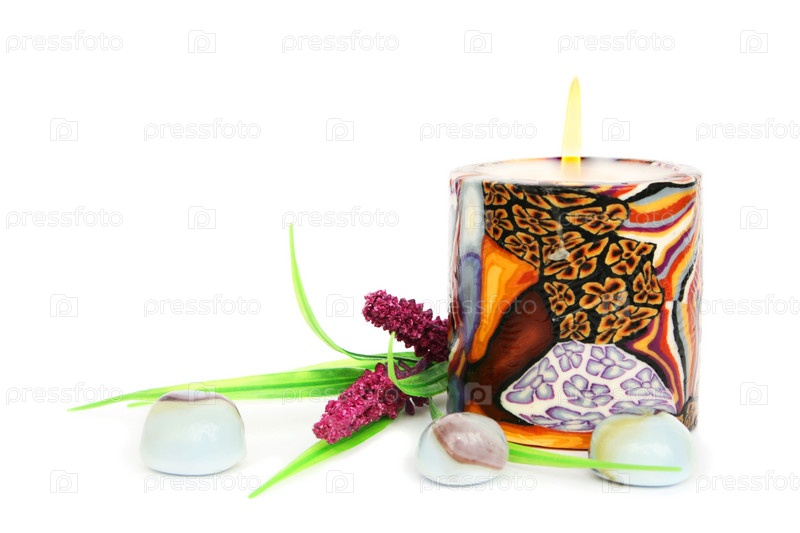 Яркая горящая свеча, камни и растения, изолировано на белом фоне