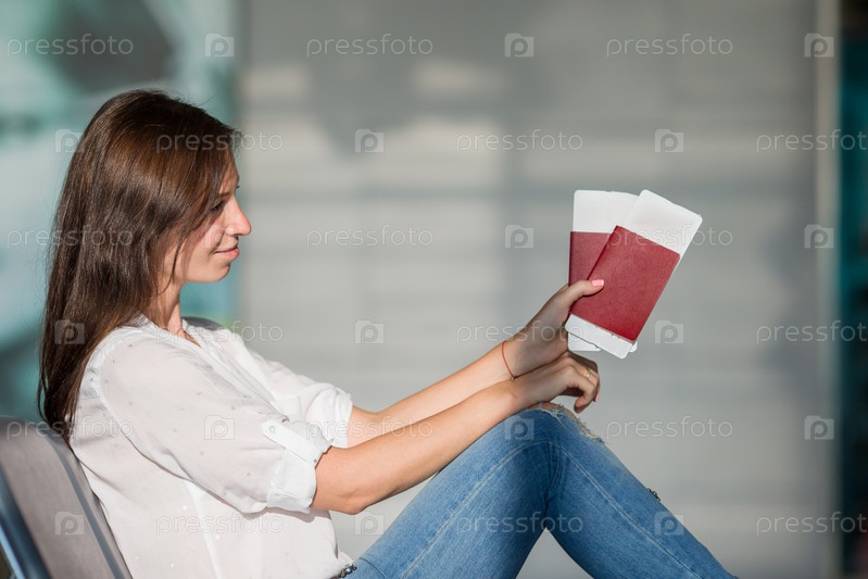 Девушка с паспортами и билетами в аэропорту