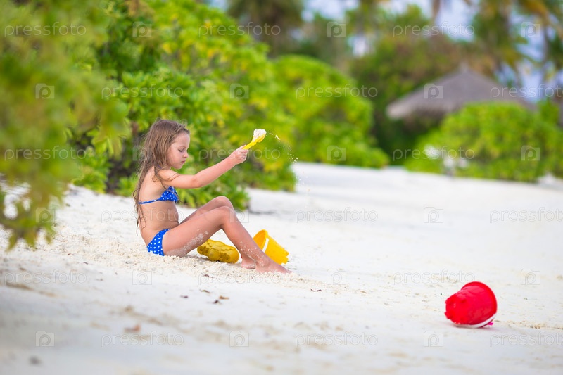 Очаровательная маленькая девочка играет с игрушками на пляже