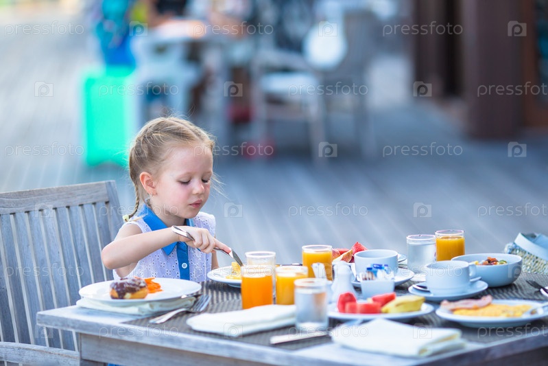 Маленькая девочка, за завтраком в открытом кафе