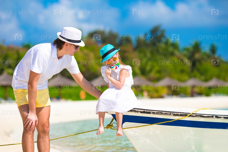 Молодой отец и маленькая дочь на тропическом пляже