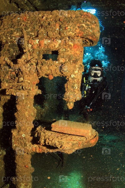 Дайвер в машинном отделении затонувшего сухогруза "Крисула" на рифе Абу-Нухас в Красном море, Египет