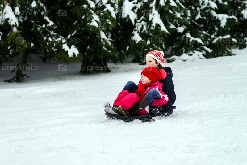 Две сестры едут на санках