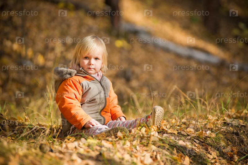 Маленькая девочка сидит на земле в осеннем парке