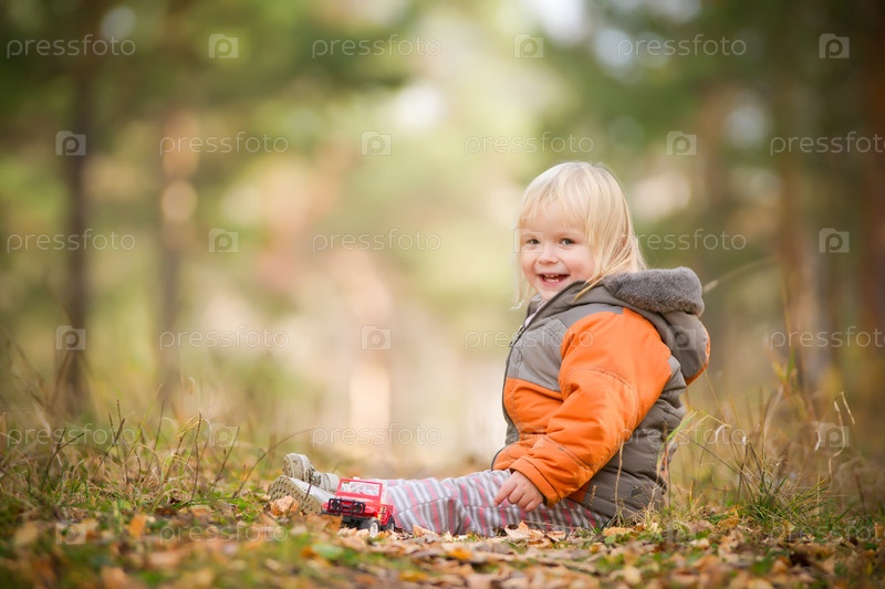Маленькая девочка сидит на земле в осеннем парке