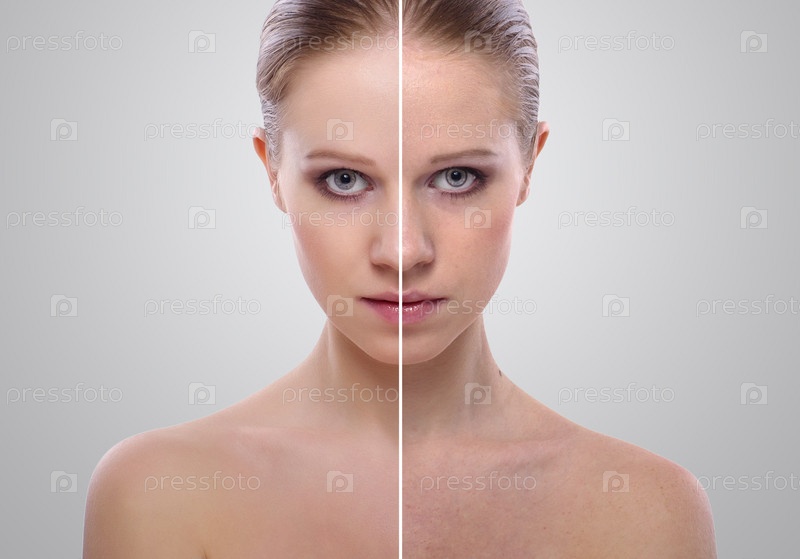 Эффект обновления кожи,девушка до и после процедуры на сером фоне