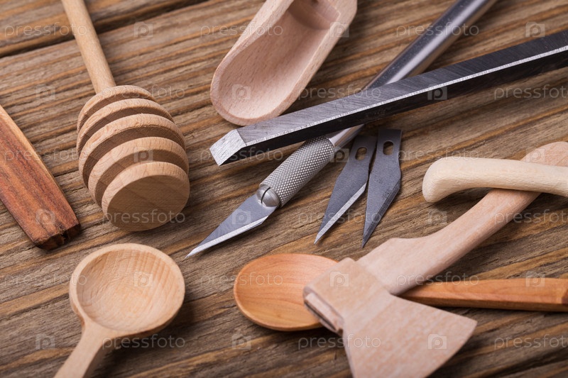 Деревянная посуда и инструменты для их создания, крупным планом