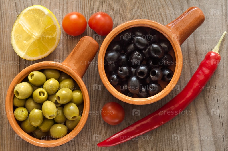 Оливки в чашках на деревянном столе