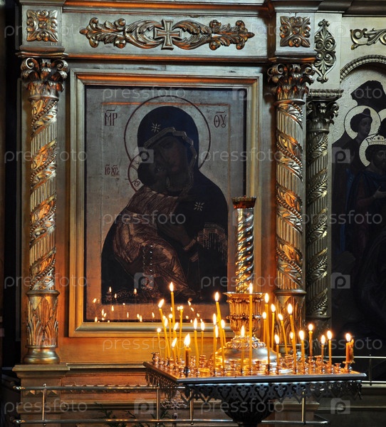 Свечи в православном храме перед иконой богородицы