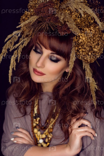 Красивая молодая женщина с сухими цветами на голове