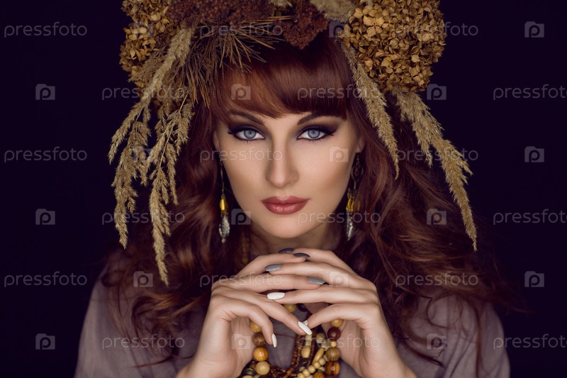Красивая молодая женщина с сухими цветами на голове