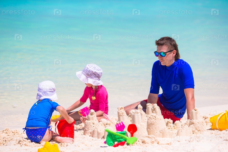 Отец играет с дочерьми на пляже