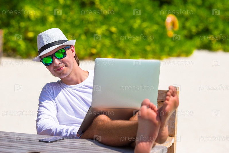 Молодой человек с ноутбуком на пляже