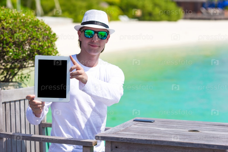 Молодой человек показывает планшет