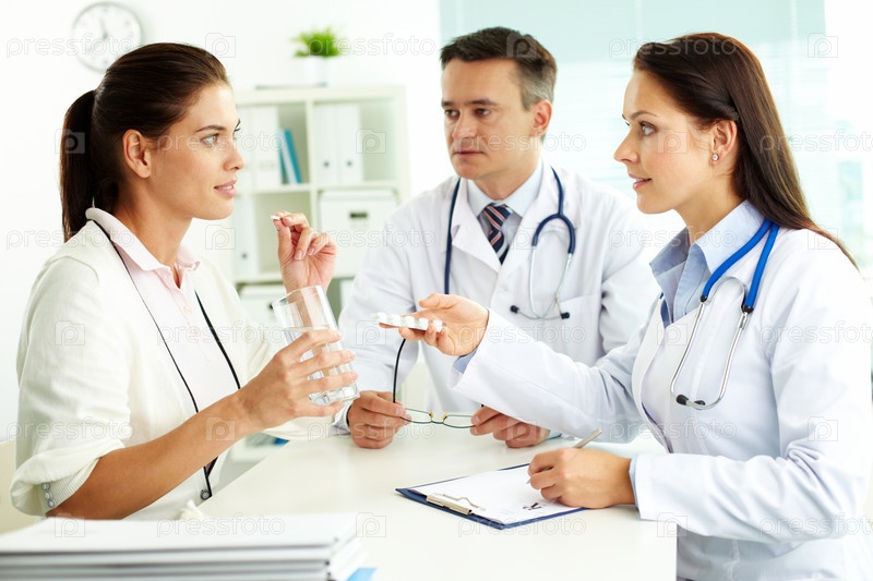 Трое врачей обсуждают покупку лекарств в кабинете поликлиники