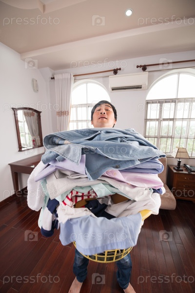 Мужчина с корзиной грязной одежды