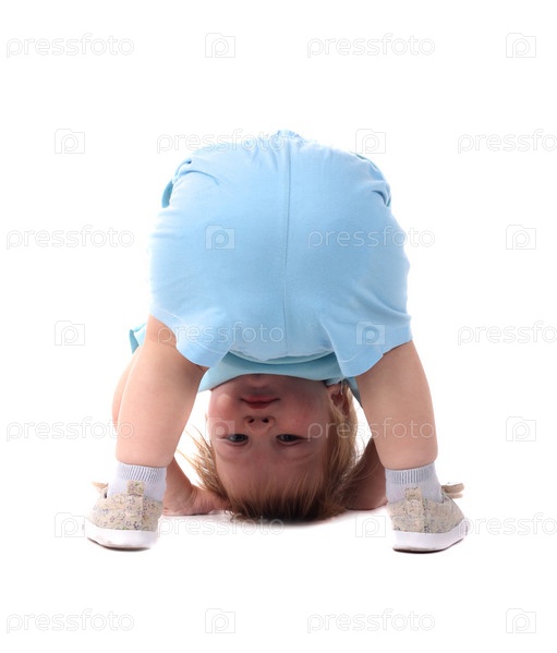 Маленький мальчик вниз головой, изолирован на белом фоне