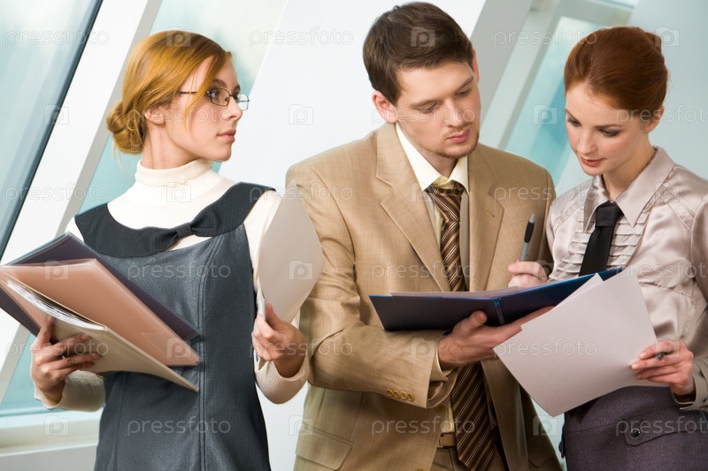 Портрет уверенных в себе сотрудников, которые смотрят на деловой документ и читают его перед подписанием