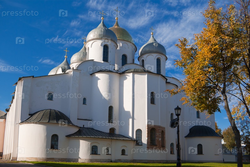 Собор святой софии в новгородском кремле в солнечный осенний день, россия