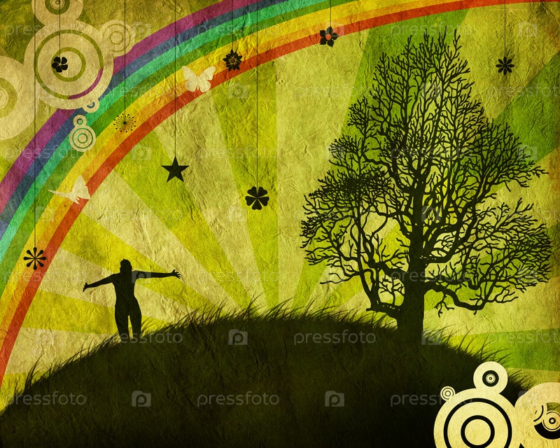 Человек на острове с радугой и большим деревом