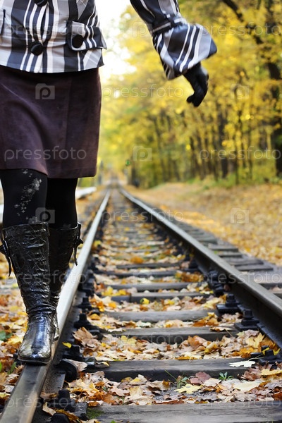 Женщина идет по рельсам в осеннем лесу
