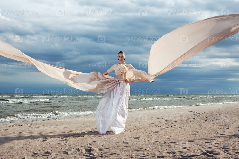 Девушка позирует в длинном платье на пляже