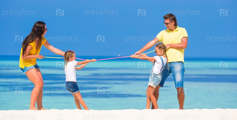 Счастливая семья играет на пляже