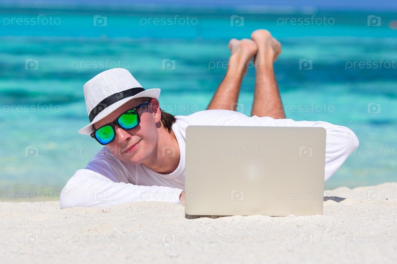 Молодой человек с ноутбуком на пляже