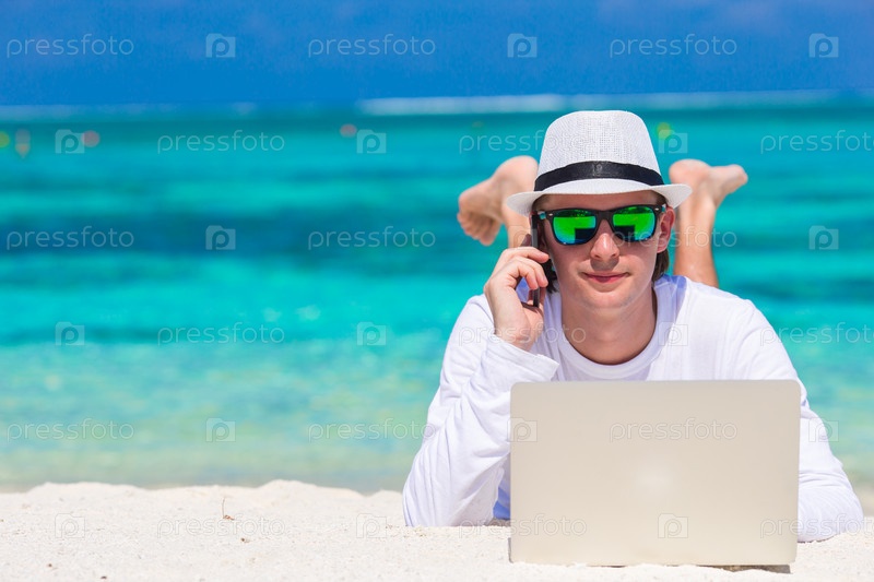 Молодой человек с ноутбуком на пляже