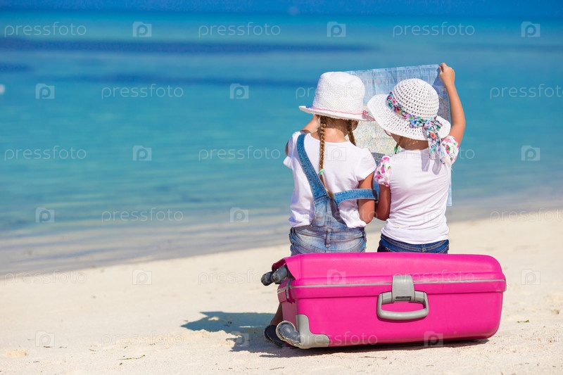 Маленькие девочки с картой на пляже