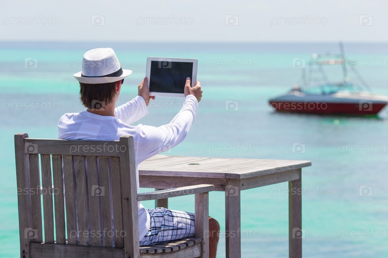 Молодой человек снимает катер на планшет