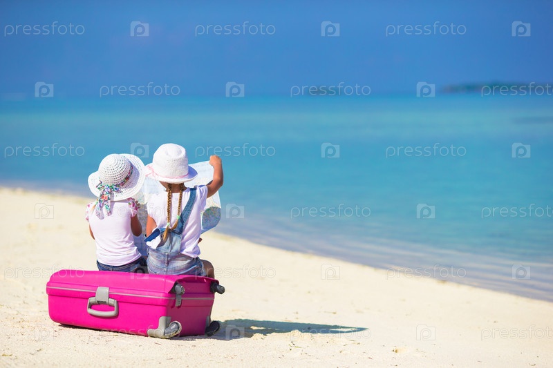 Маленькие девочки с картой на пляже